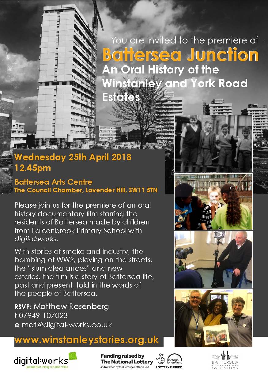Wednesday 25th April sees the launch screening of Battersea Junction – Stories from Winstanley and York Road Estates made with Falconbrook Primary School. It’s at the lovely Battersea Arts Centre. There are a few places remaining, if you would like to come, please RSVP to the email address on the invite below.